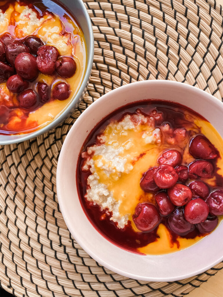 Baza jest zawsze podobna, ale dodatki możesz dodawać zgodnie z własnymi preferencjami, porą roku i tym, co akurat masz w lodówce. Ja z tęsknoty za słońcem i kolorem (i z wygody) w marcu często używałam musu z mango (z puszki) i mrożonych wiśni. Choć zwykle gotuje tylko dla siebie, zawsze robię co najmniej 2 porcje, bo ta kasza równie dobrze smakuje na zimno jako deser.