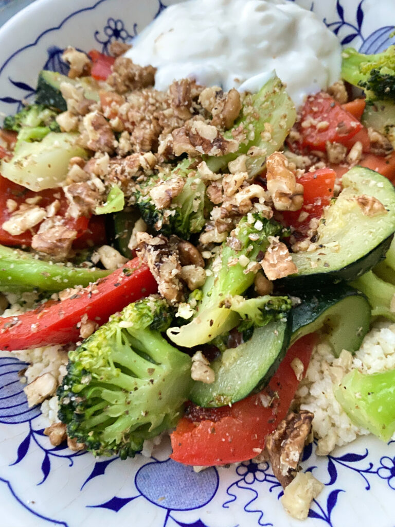 4. Na głęboki talerz wyłóż kaszę, na to warzywa. Orzechy włoskie pokrusz w ręce i posyp nimi warzywami. Możesz podawać z ugotowanymi jajami oraz jogurtem naturalnym lub serem feta.